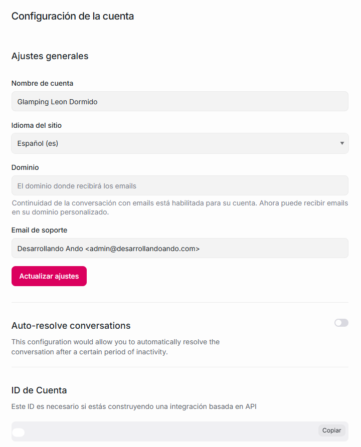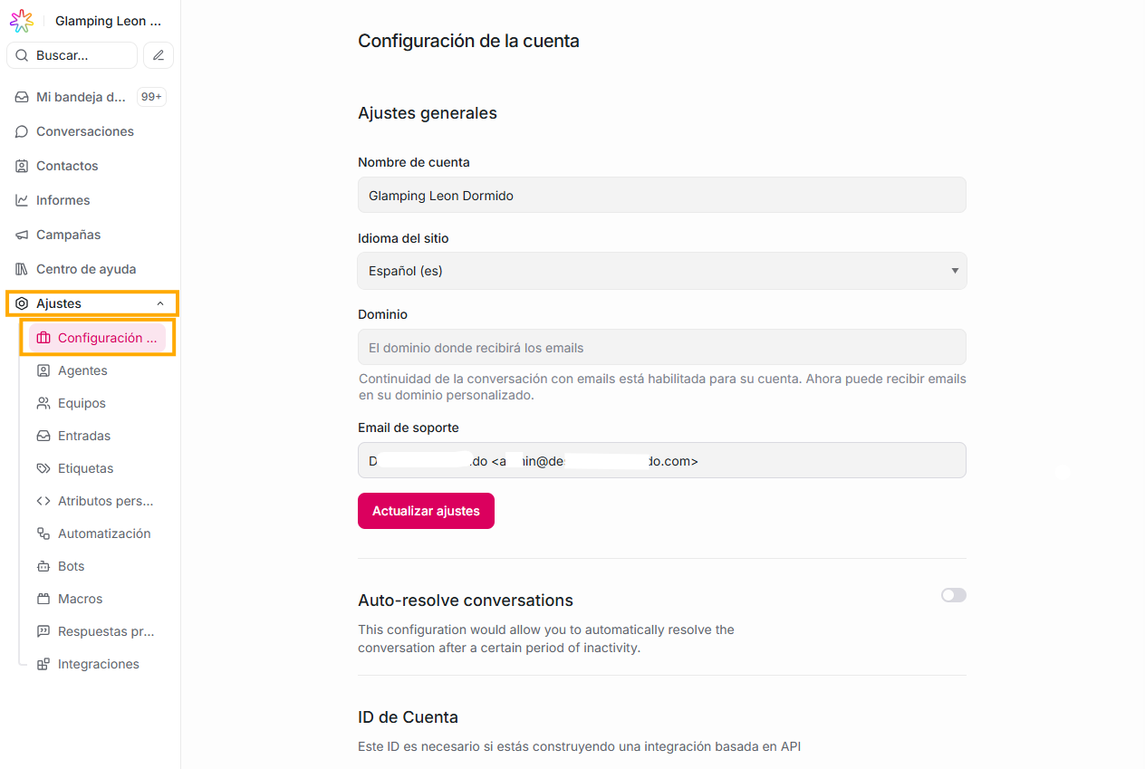 Puedes activar o desactivar la opción Auto-resolve conversations: esta es una función que cierra automáticamente (marca como “Resuelta”) cualquier conversación que lleve cierto tiempo sin actividad, que puede suceder en escenarios como: