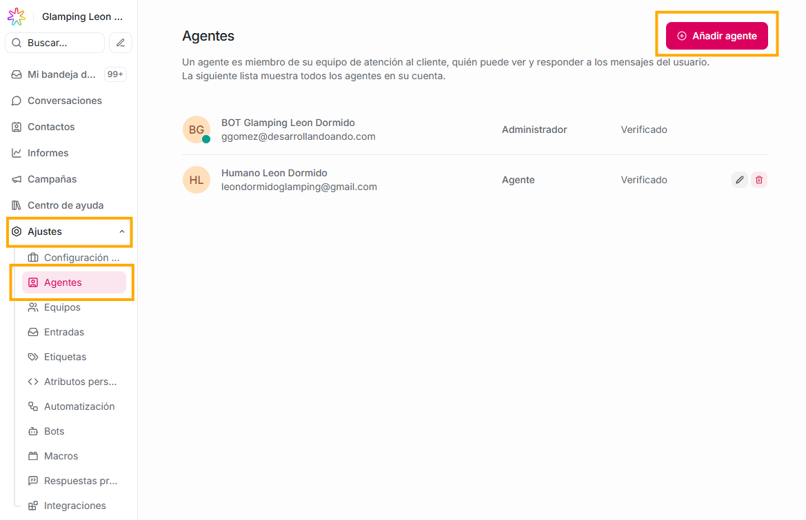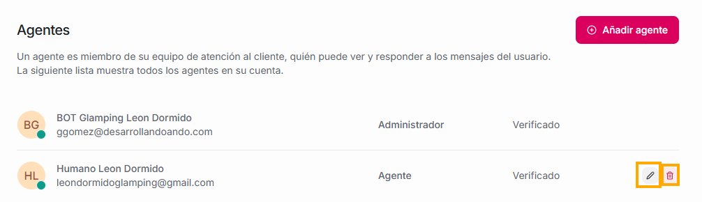 Si quieres editar o eliminar alguno de tus agentes, solo debes ubicarte en la sección - Ajustes, - Agentes, y verás que al finalizar cada uno de los agentes con los que cuentas, hay un ícono de lápiz.