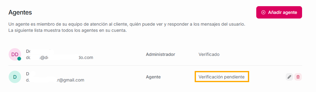 Una vez lo crees, verás en tu sección de Ajustes - Agentes, que al final de los datos de tu nuevo agente dirá “Verificación pendiente”