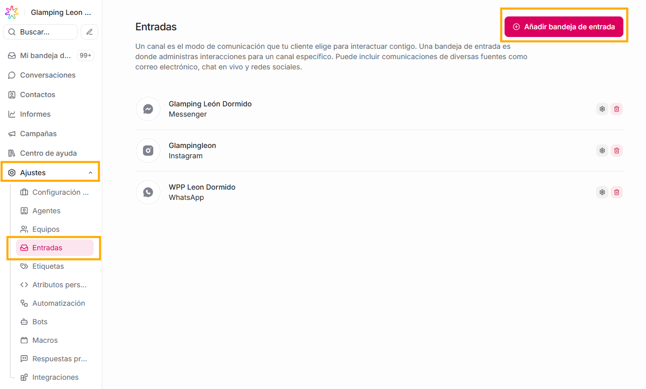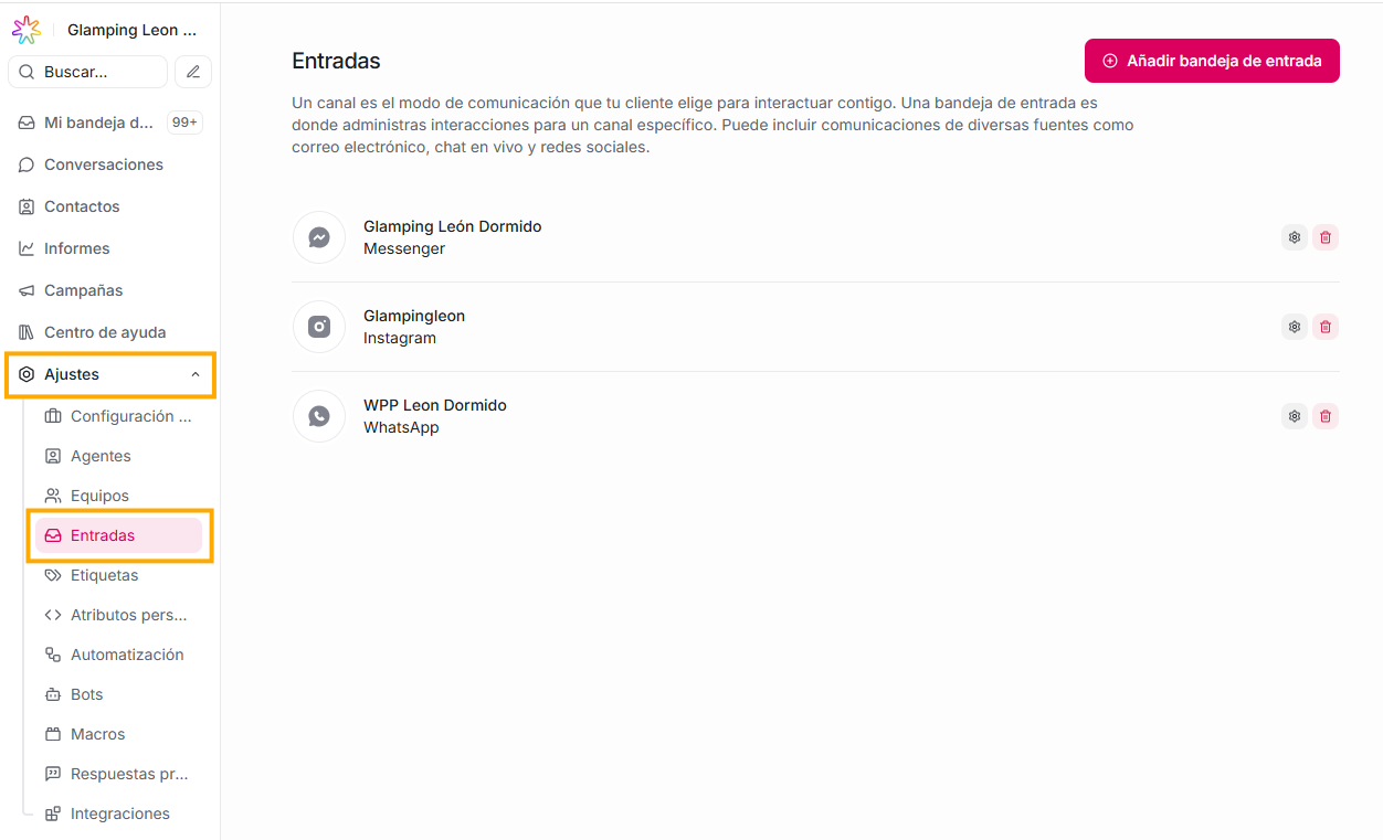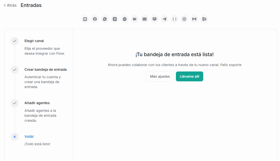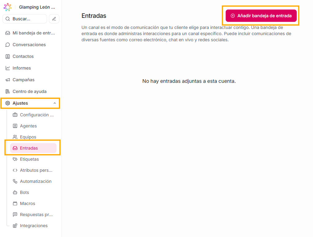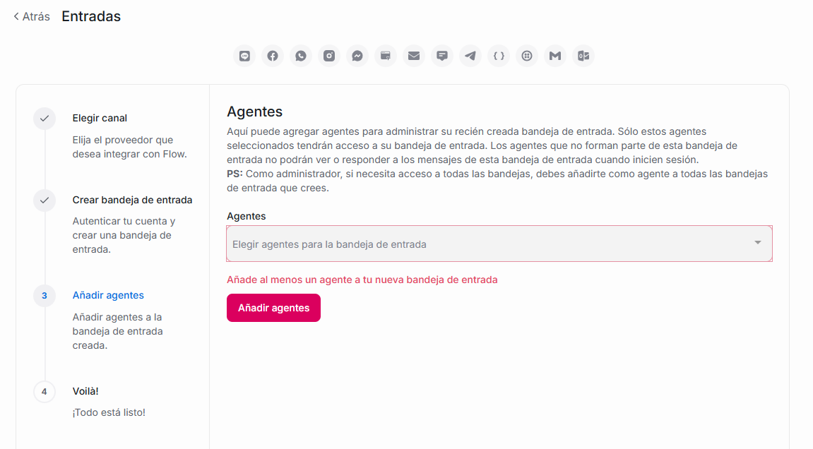 Si queremos agregar un nuevo canal, debemos dar click en el botón Añadir bandeja de entrada