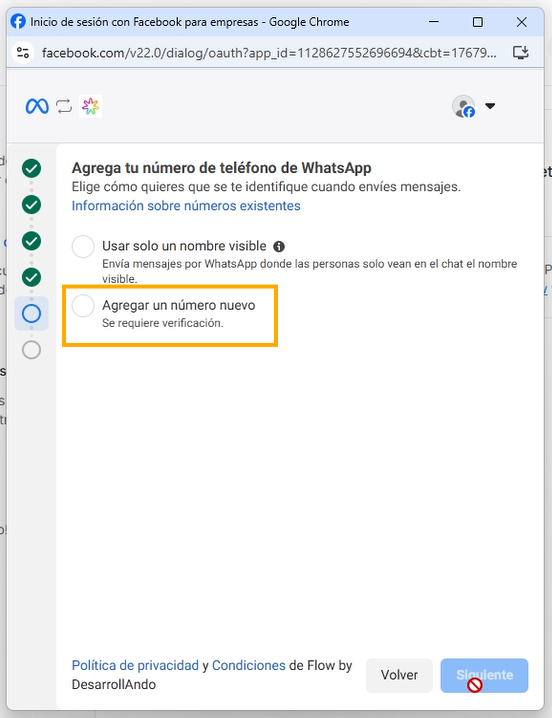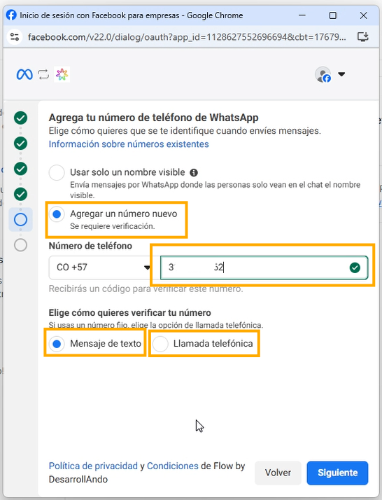 - Elegimos la opción Agregar un número nuevo, escribimos el número de whatsapp que estamos enlazando y elegimos el método por el que recibiremos el código para verificar nuestro número y damos click en Siguiente