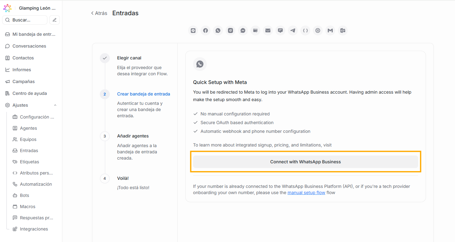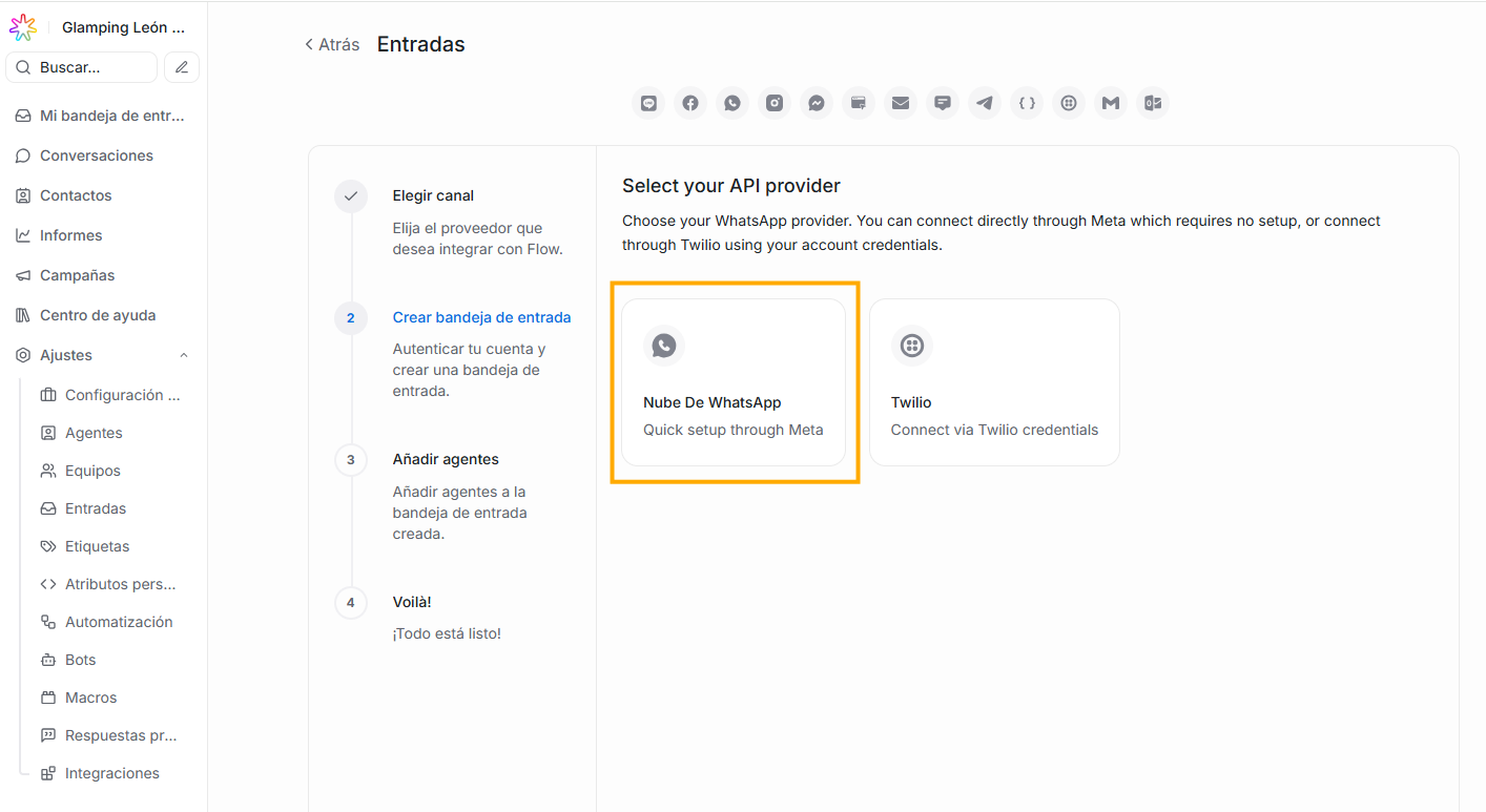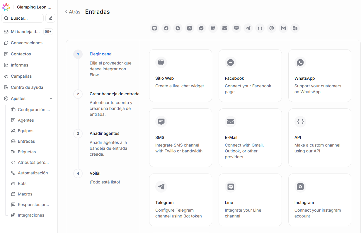 Una vez lo hagas, verás todos los canales que puedes integrar a tu plataforma.