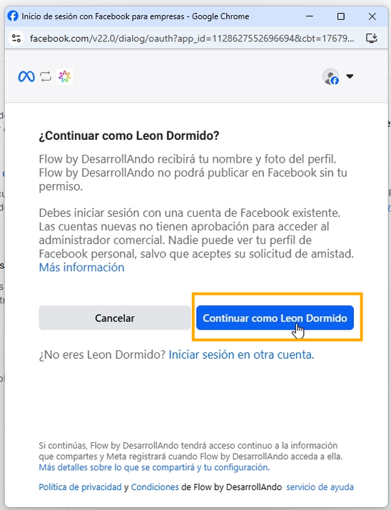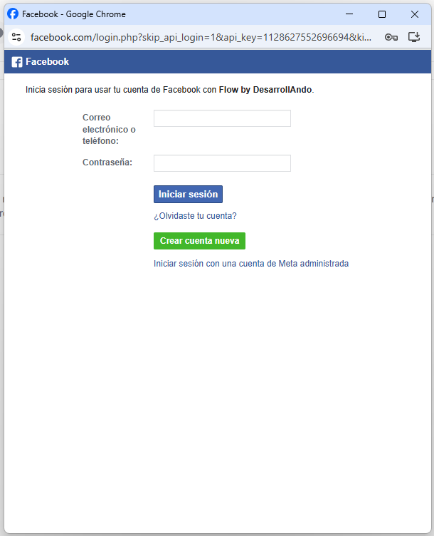 - Nos redirigirá a la página de inicio de sesión de facebook. Debes ingresar las credenciales y logearte.