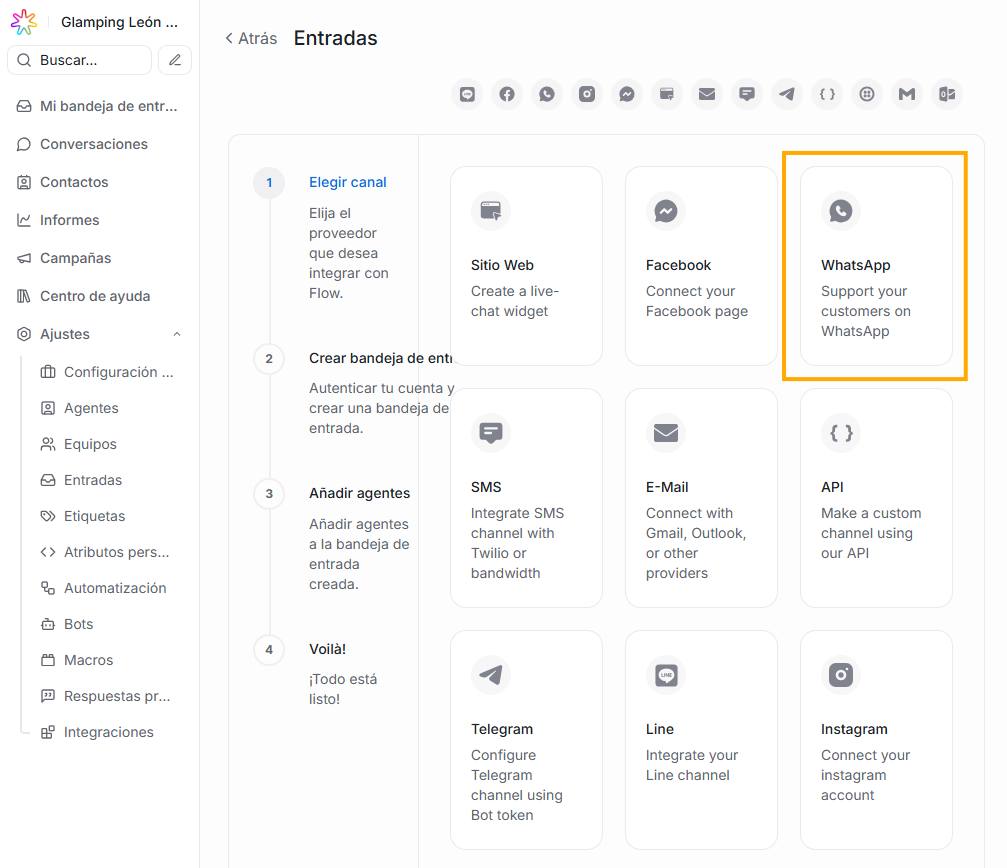 - Seleccionamos el canal que queremos integrar, para este ejemplo: whatsapp