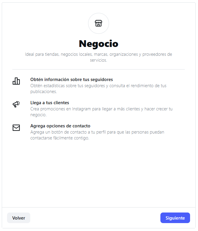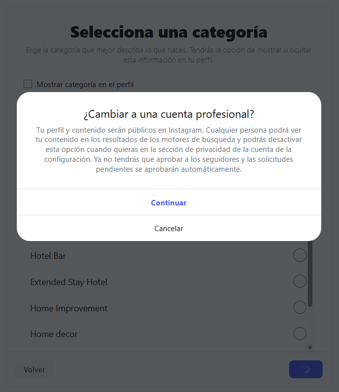 - En adelante solo deberás responder algunas preguntas, como si eres un negocio o un creador de contenido, en qué categoría estas (hotel, por ejemplo), diligenciar algunos datos, y finalmente, dar click en permitir cuando así Instagram te lo pregunte.