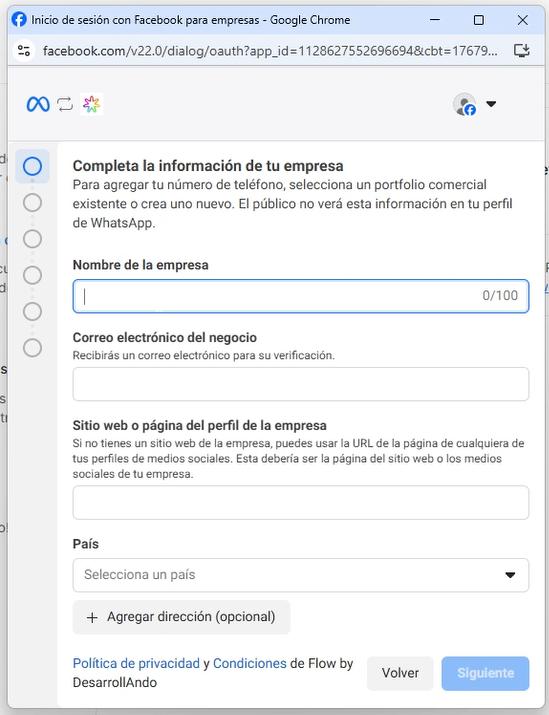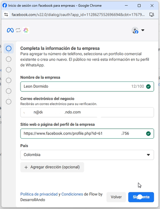 - Diligenciamos los datos del formulario. En el campo sitio web ponemos el enlace del facebook de nuestra empresa. Al completar todos los campos damos click en el botón siguiente