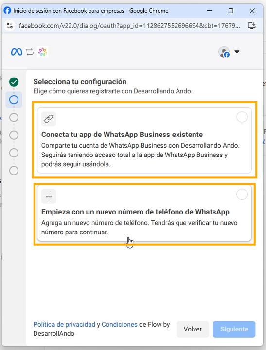 - Si previamente ya tenemos instalada la aplicación de whatsapp business y la hemos utilizado, seleccionamos la opción Conecta tu app de Whatsapp Business existente, pero si no es tu caso, puedes elegir la opción Empieza con un nuevo número de teléfono de whatsapp. Una vez hemos elegido la opción indicada, damos click en el botón siguiente.