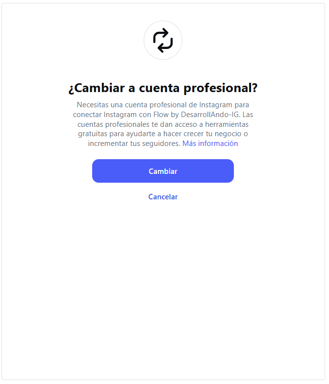Te solicitará cambiar tu cuenta a profesional (Click en el botón Cambiar). Esta aceptación es necesaria para poder lograr crear este canal.