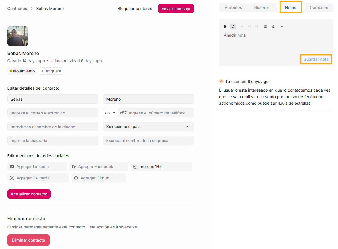Las Notas de contacto son una herramienta para que los agentes puedan guardar información interna sobre un cliente. No son visibles para el cliente y solo sirven para uso del equipo.