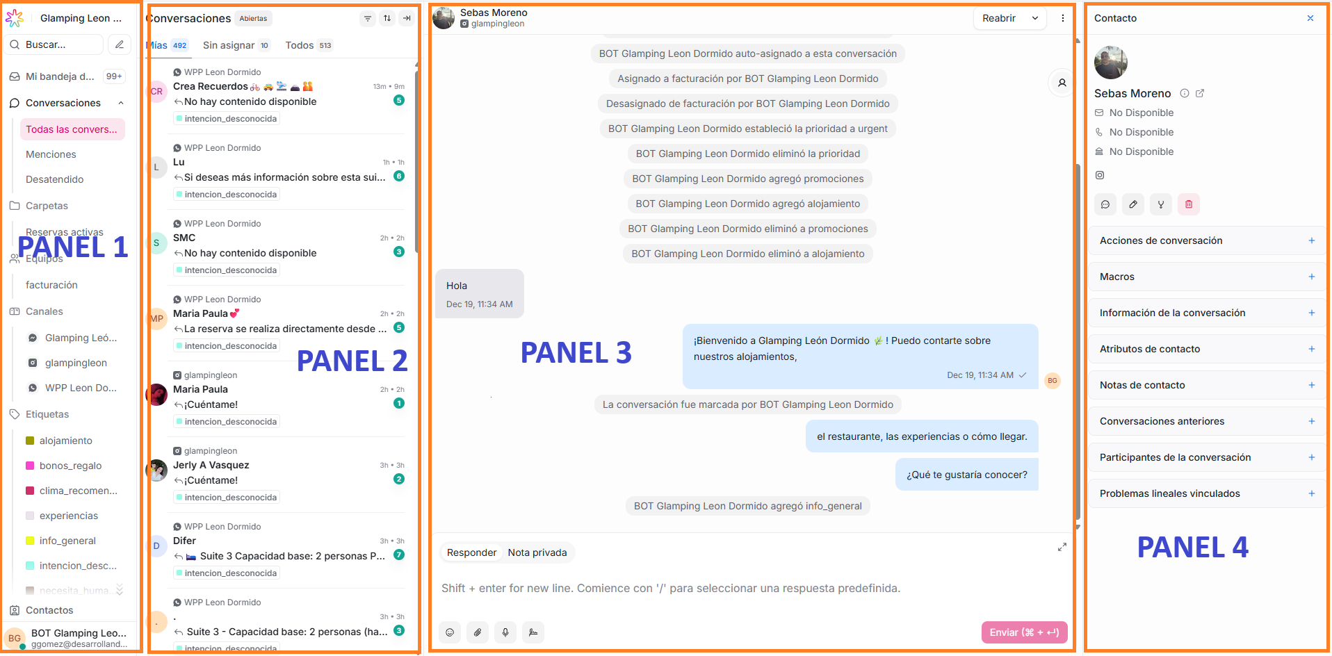 Para un mejor entendimiento de los filtros que puedes aplicar para acceder a la conversación que desees, desglosamos en 4 paneles la explicación de la bandeja de conversaciones, de la siguiente manera: