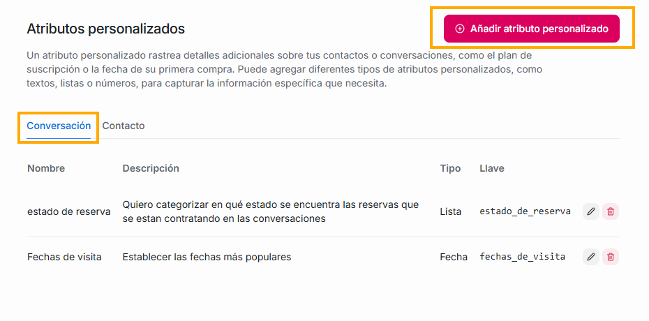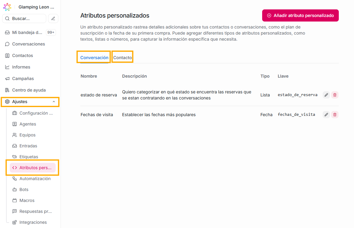 Por ejemplo, si mi empresa es un glamping, y quiero clasificar las conversaciones de acuerdo a los usuarios que ya reservaron, o quienes estan a punto de hacerlo, puedo crear mi atributo personalizado de conversación llamado “estado de reserva”, y hacer que este atributo tenga tres opciones: