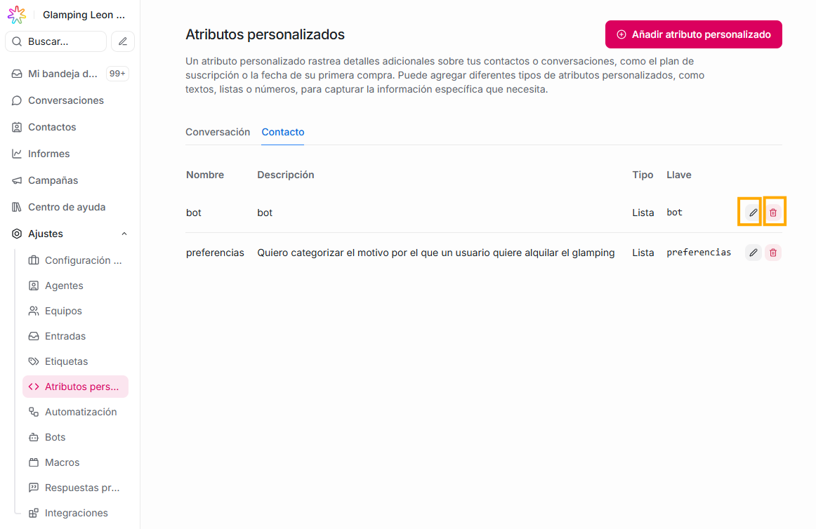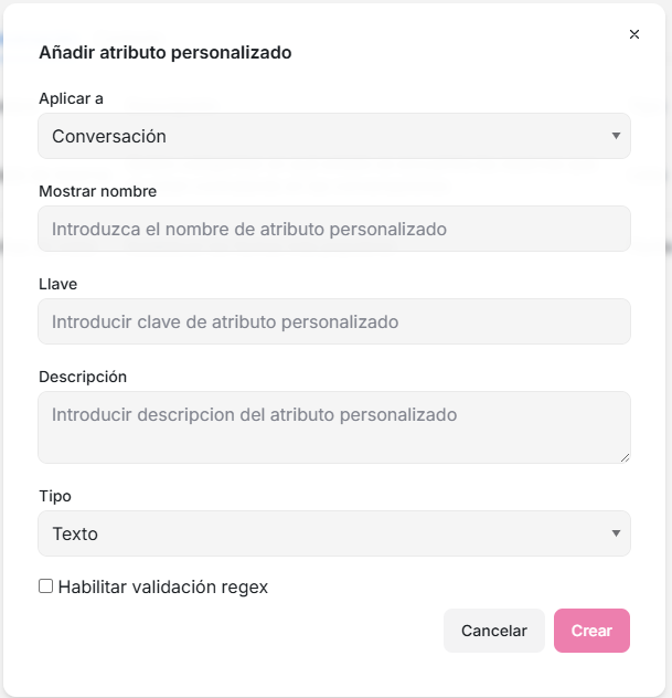 Los atributos de contacto son campos personalizados que te permiten guardar información adicional del cliente más allá de los datos básicos. Te servirán para enriquecer el perfil del contacto, segmentar, automatizar y dar mejor contexto a los agentes durante una conversación. Los atributos que crees en esta sección podrás verlos y usarlos en: