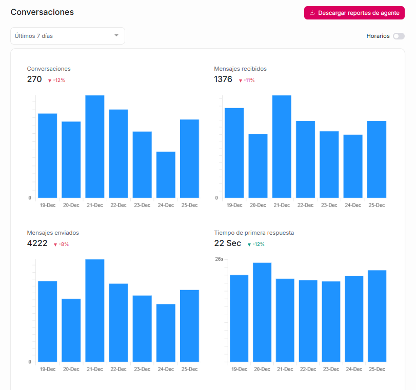 Te muestra en qué horarios por día se están dando las conversaciones de los últimos 7 o 30 días.