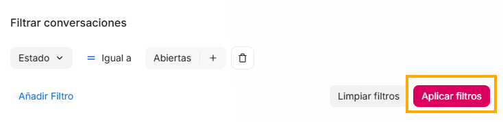 Para que las conversaciones se filtren de acuerdo a esta selección que realizaste, debes dar click en el botón “Aplicar filtros”. Si por el contrario no quieres que se filtren las conversación en tu bandeja de acuerdo a estos filtros, puedes seleccionar el botón “Limpiar filtros”