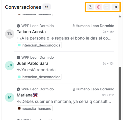 - En la parte superior de este segundo panel, verás la palabra “Conversaciones”, y al final de esta línea, 3 íconos. A continuación te describiremos uno a uno estos íconos: