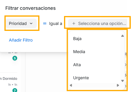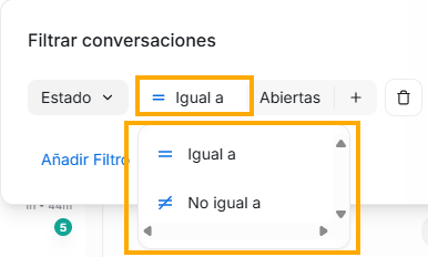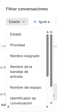 Luego de estos items mencionados, continuará la lista con todos los atributos de conversación personalizados que hayas creado en tu plataforma (Si quieres aprender cómo crearlos y administrarlos, puedes visitar la sección del manual “Ajustes”, en la opción “Atributos personalizados”. Recuerda que en este filtro que estamos viendo solo aparecerán los atributos de conversación, no de contacto)