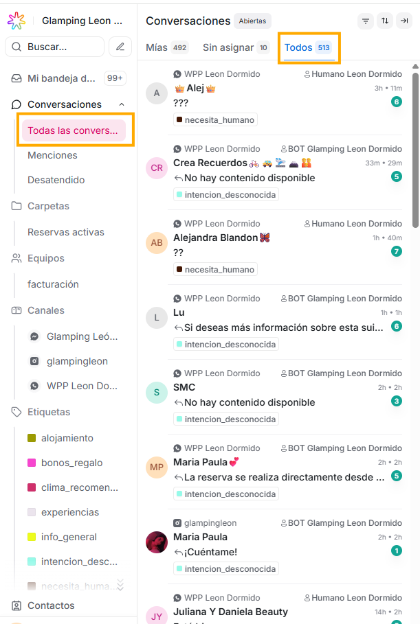 - Todos: en este filtro estarán todas las conversaciones, es decir, tanto las que han sido asignadas a un agente (incluyéndote a ti y a tus compañeros con rol agente), como las que aún no cuentan con un asesor encargado.