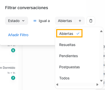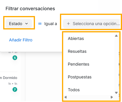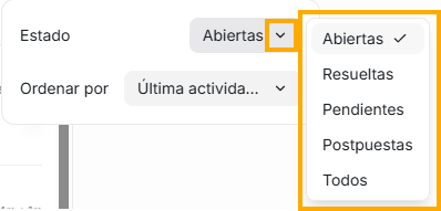La primera siempre te mostrará las opciones de estado que pueden tener tus conversaciones, solo debes dar click en la flecha hacia abajo que esta al final del campo. La que elijas de la lista, será la palabra que verás junto al título Conversaciones que encabeza este segundo panel, esto debido a que este será el filtro principal de todas tus conversaciones, este es el filtro principal a partir del cual se ejecutarán todos los demás filtros.
